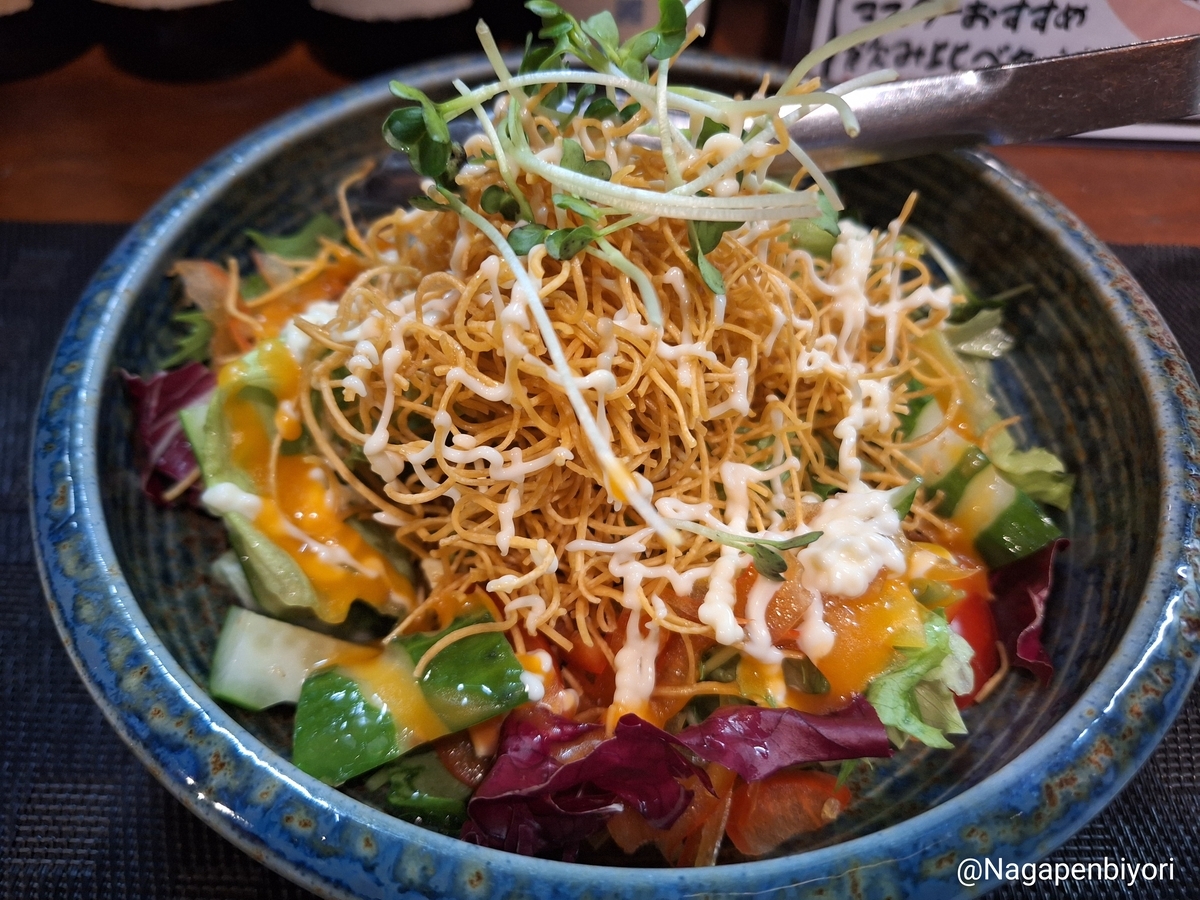 パリパリ麺のチョレギサラダハーフ(530円)。いつものサラダ。ドレッシングがとても美味しいんです。