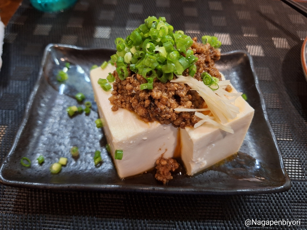 肉味噌ヤッコ(480円)。ステーキとか頼まずに飲みメインのときに頼む品。美味しくてお腹にたまります。