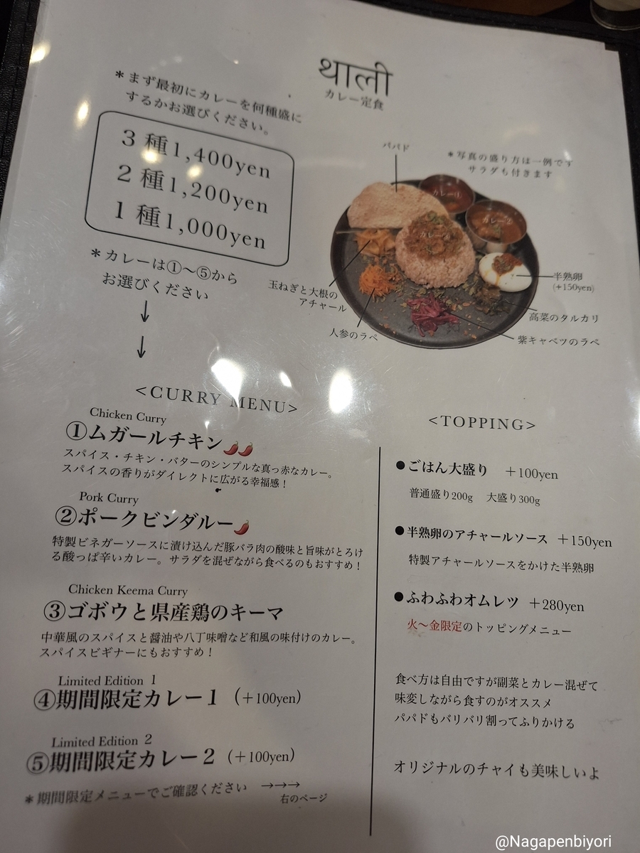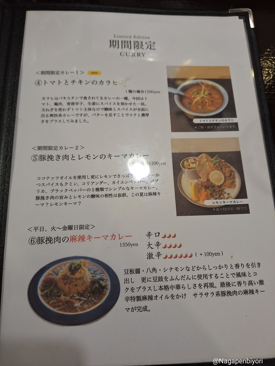 カレーメニュー。定番3種、限定2種から選ぶことが出来ます。この他、アラカルトやコースメニューもあります。