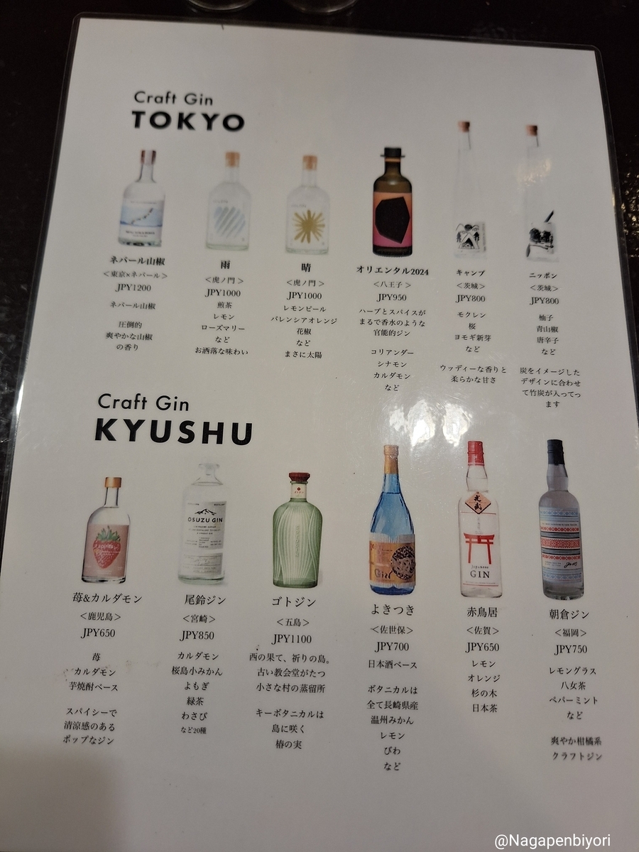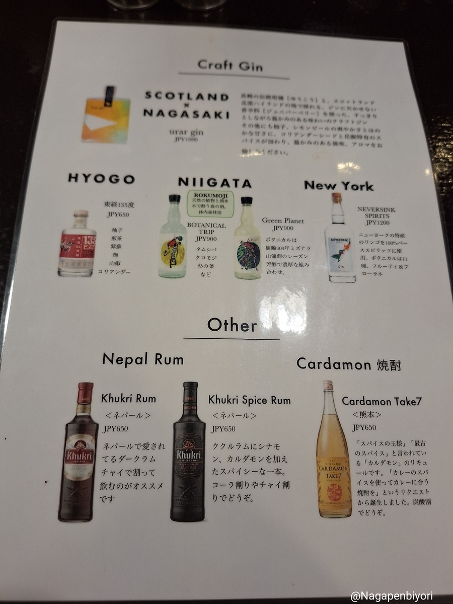 クラフトジンのメニュー。豊富なので、私はいつもクラフトジンとカレーを注文することにしています。