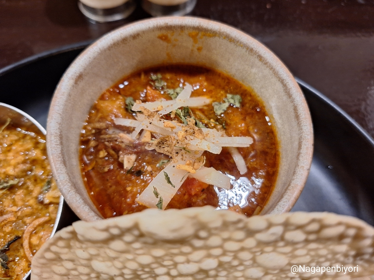④のカラヒはパキスタンのカレー。玉ねぎはなく、トマトベース(スパイスカレーはだいたい玉ねぎをベースにします)で酸味があり、チキンは裂いてあります。そこにバターのコクと、生姜の鮮烈さが足されています。ごはんにぴったり。