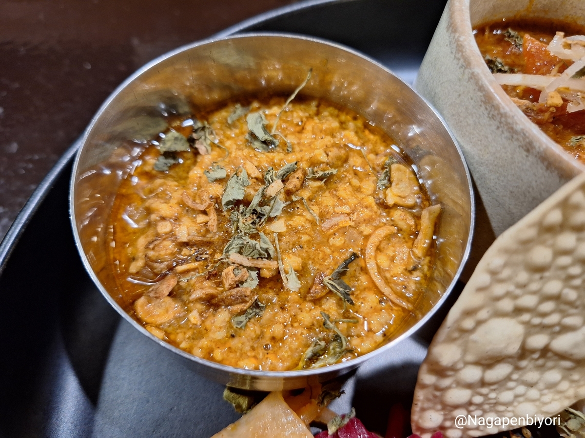カレー定食2種④⑤(1,200円)+半熟卵アチャールソース(150円)。